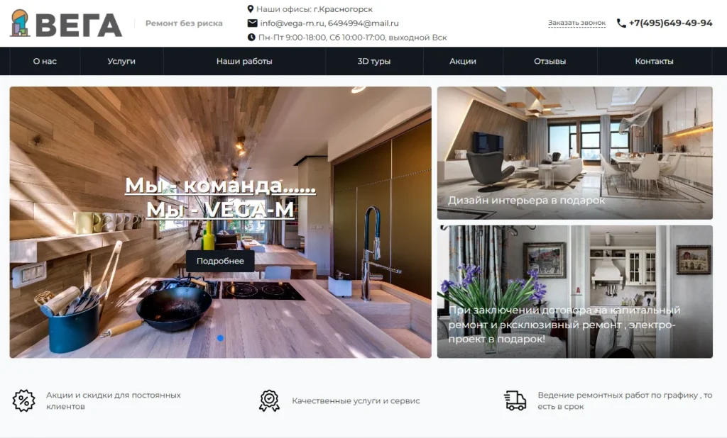 VEGA-M — ремонтная компания из Красногорска, выполняющая косметические, капитальные и дизайнерские ремонты квартир и частных домов в Москве и Подмосковье. Сервис строится на понятной воронке: первичный расчёт и консультация, детализированная смета, календарный план, договор с фиксированными сроками и бюджетом, сопровождение прораба и фотоотчёты. На сайте — портфолио реализованных объектов, 3D-туры по завершённым проектам, отзывы и действующие акции; указаны контакты, режим работы и почтовые адреса для связи. VEGA-M ведёт полный цикл: демонтаж, черновые работы (штукатурка/стяжка), монтаж электрики и сантехники, отделка стен, полов и потолков, установка дверей, света и сантехприборов, финальная уборка. При работе по дизайн-проекту следуют ведомостям и узлам, что помогает избегать переделок. Отдельный акцент — «ремонт без риска»: прозрачность сметы, предсказуемость сроков и поддержка клиента на протяжении всего проекта. Для новых квартир предусмотрены пакеты «под заселение». Гарантия оформляется актами.