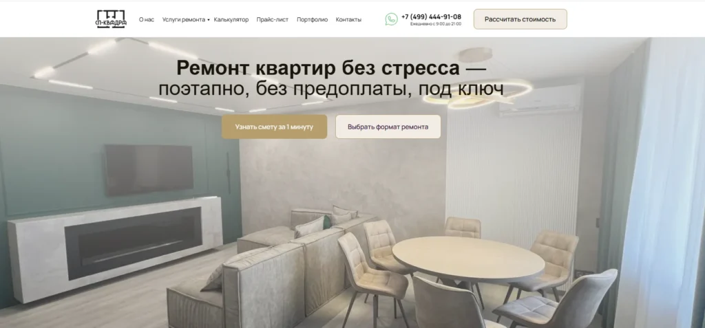 Подрядчик по ремонту квартир и домов в Москве и области. Основной принцип компании — ремонт «без сюрпризов»: фикс-смета, понятные этапы, фотоотчёт и гарантия. Клиенту предоставляется бесплатный замер, консультация и помощь в подборе материалов.